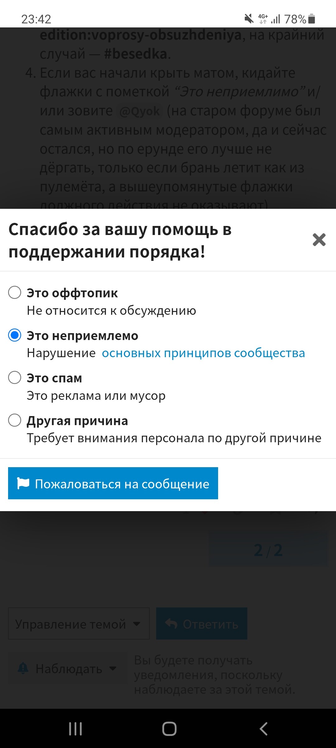 Если вас начали крыть матом, кидайте флажки с пометкой “Это неприемлимо” и/или зовите @Qyok (на старом форуме был самым активным модератором, да и сейчас остался, но по ерунде его лучше не дёргать, только если брань летит как из пулемёта, а вышеупомянутые флажки должного действия не оказывают). @moderators придут и уладят конфликт, на старом форуме целые темы за срач удаляли, хоть (увы!) и крайне редко.