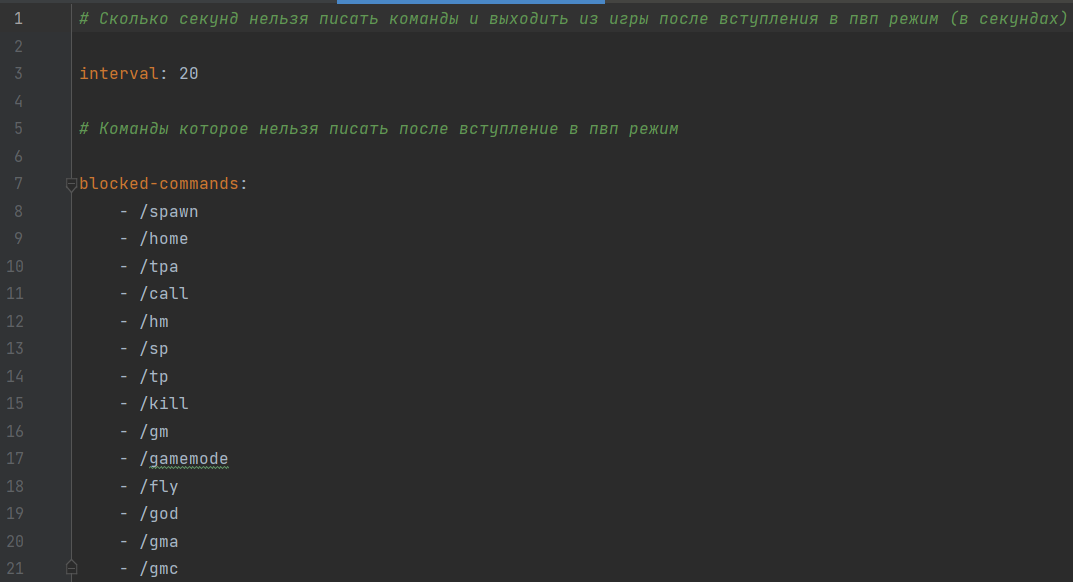 blocked-commands: - Настройка позволяет указать какие именно команды будут запрещены в пвп режиме. Каждую команду начинать с тире, отступая 4 пробела от начала, после тире, пробел, после пробела команда (учитывая /)