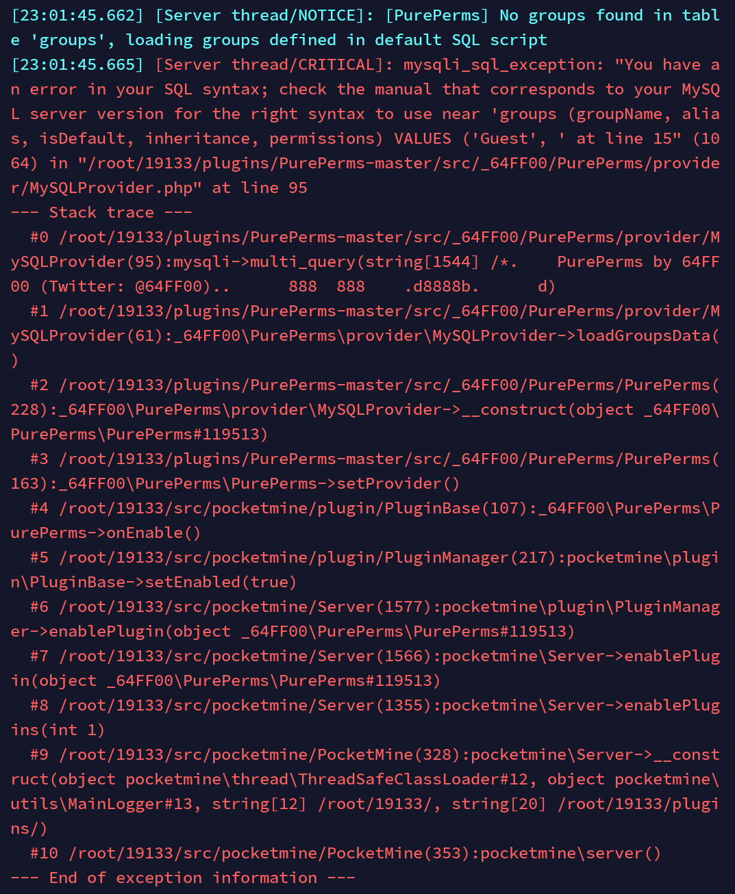[Server thread/CRITICAL]: mysqli_sql_exception: “You have an error in your SQL syntax; check the manual that corresponds to your MySQL server version for the right syntax to use near 'groups (groupName, alias, isDefault, inheritance, permissions) VALUES (‘Guest’, ’ at line 15” (1064) in “/root/19133/plugins/PurePerms-master/src/_64FF00/PurePerms/provider/MySQLProvider.php” at line 95