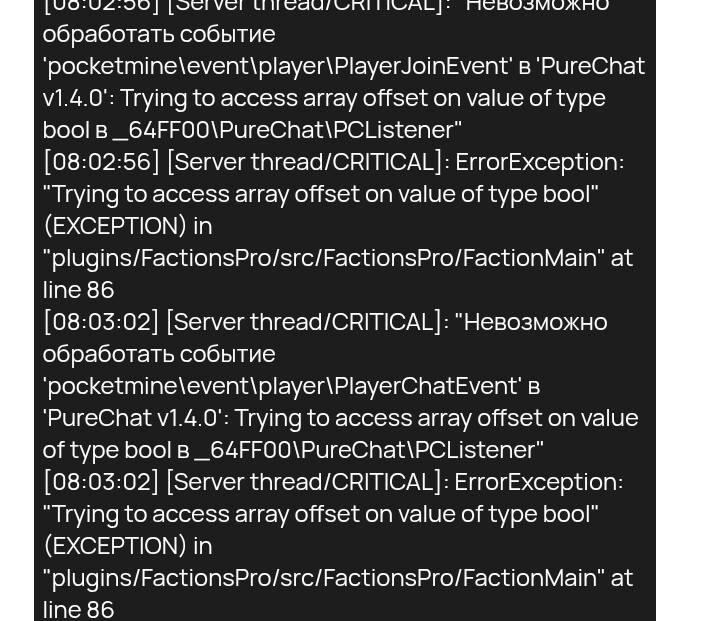 :03:02] [Server thread/CRITICAL]: “Невозможно обработать событие ‘pocketmine\event\player\PlayerChatEvent’ в ‘PureChat v1.4.0’: Trying to access array offset on value of type bool в _64FF00\PureChat\PCListener”