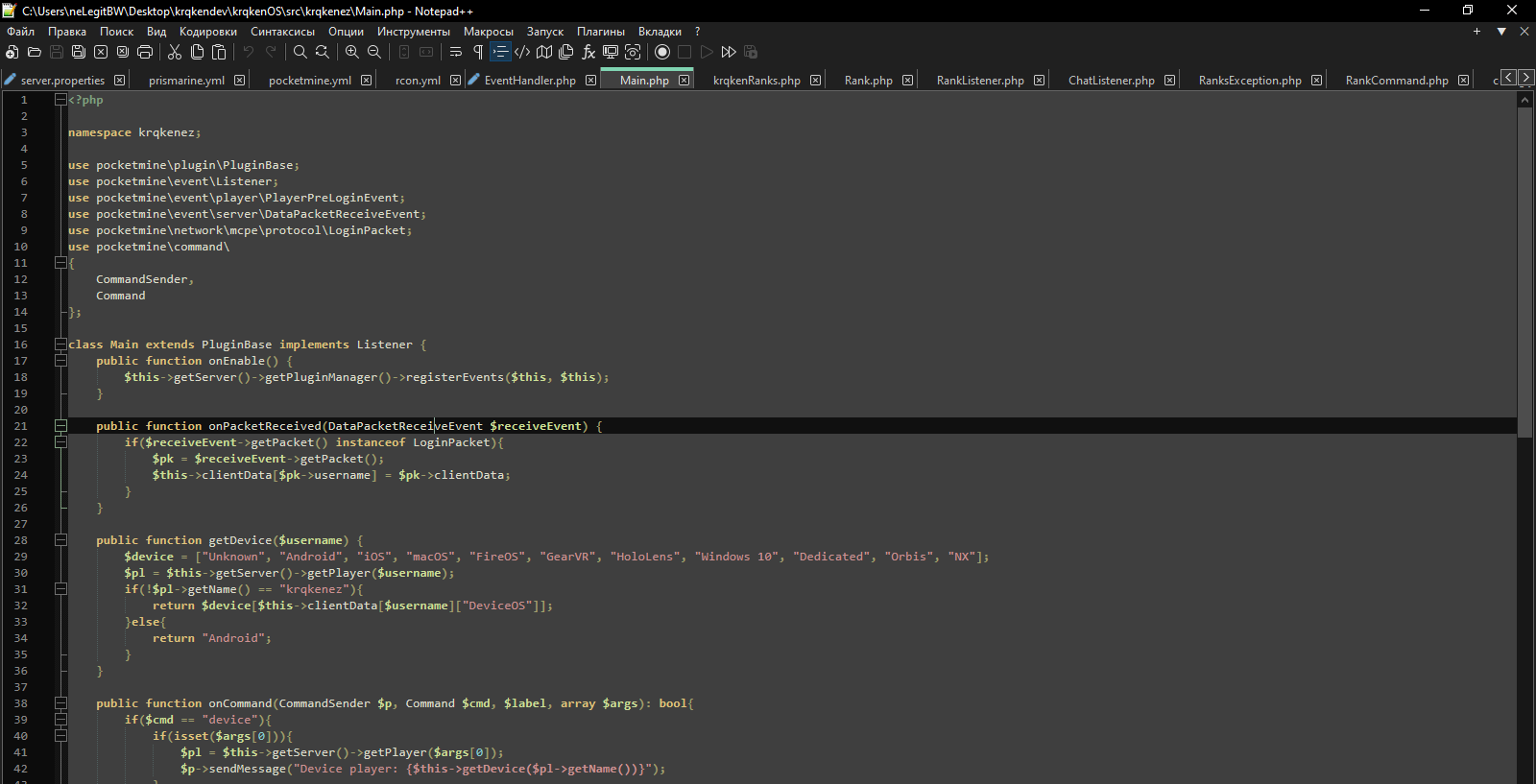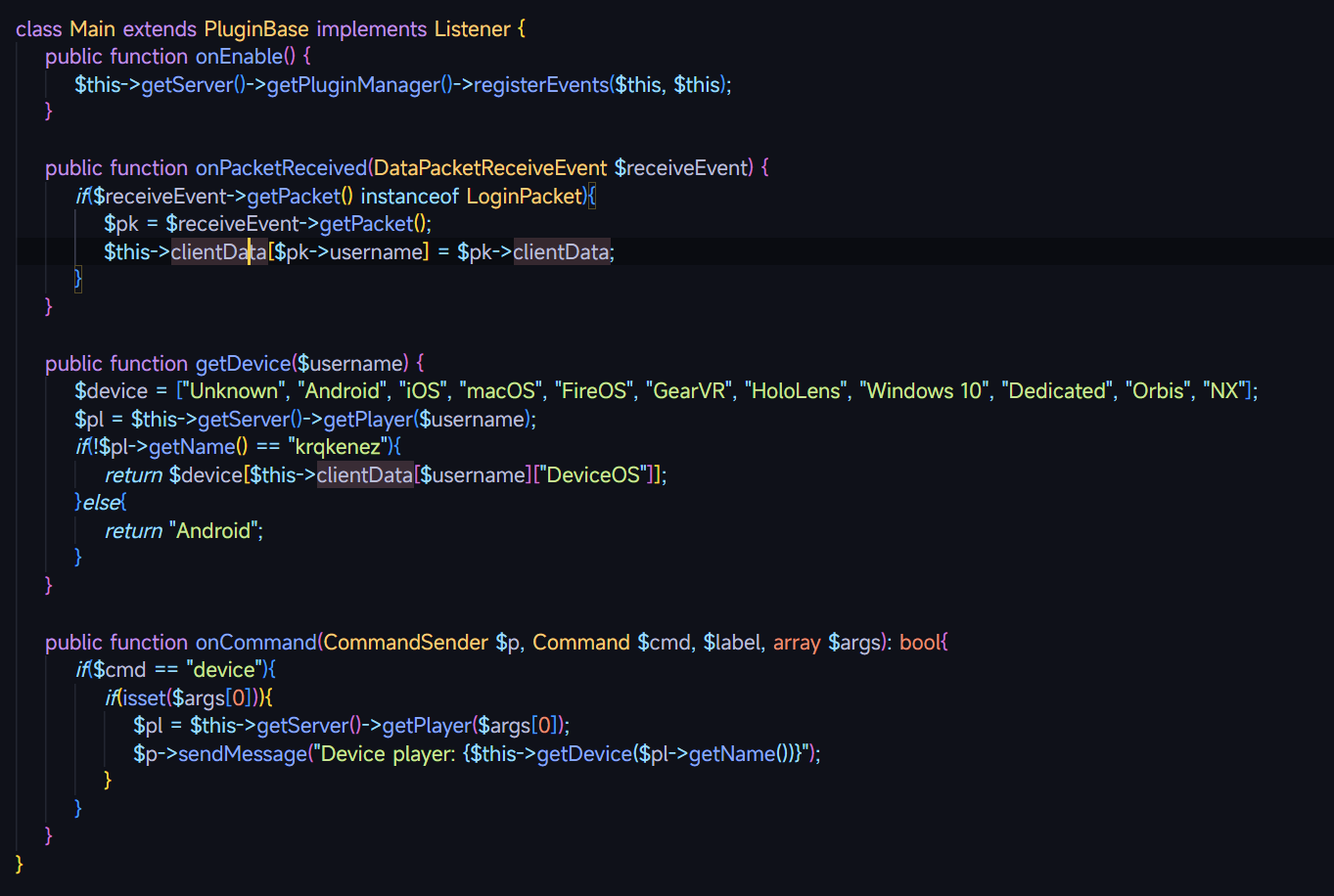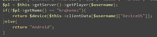 У меня вопрос к автору, этот плагин создан на приколе? Ты же буквально в коде указал что “если ник игрока будет krqkenez возвращаем ОС игрока, а если нет возвращаем Andrioid”