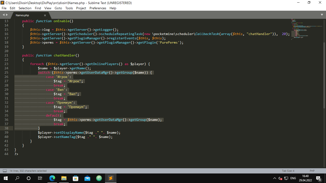 Описание: Теперь таги игроков будут видны всем игрокам на сервере. Так же при смене привилегии у игрока сразу же будет меняться таг. Вся настройка происходит в свитче в функции chatHandler(), которую вы можете лицезреть в скриншоте ниже!
