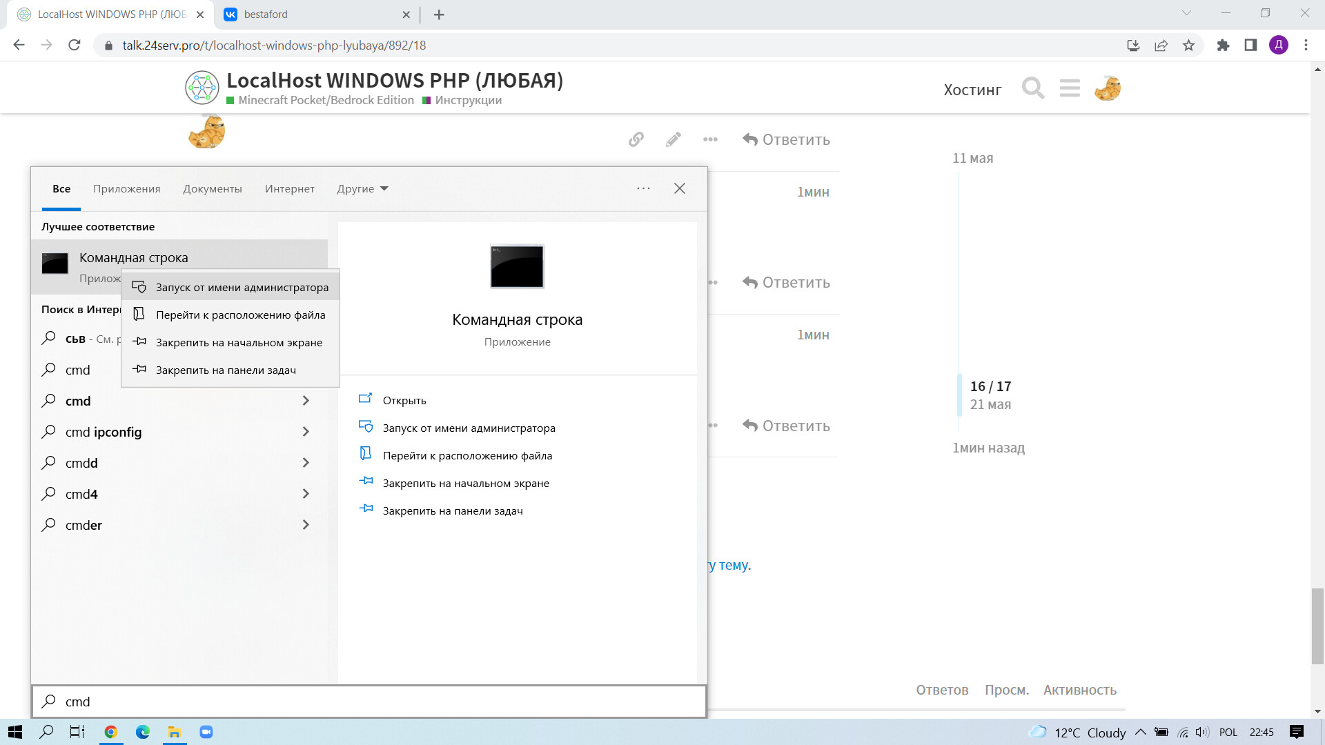 После той процедуры когда мы создали сервер, вам нужна концолька, заходим в поисковик и пишем cmd , и включаем от имени АДМИНИСТРАТОРА