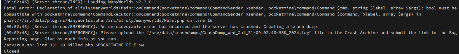 [10:05:17] [Server thread/EMERGENCY]: Please upload the “/srv/data/crashdumps/CrashDump_Wed_Jul_31-10.05.17-MSK_2024.log” file to the Crash Archive and submit the link to the Bug Reporting page. Give as much info as you can.