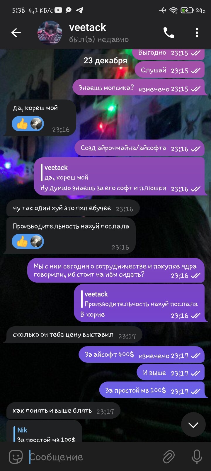 Сори у меня тот акк уже давно улетел (тг не любит вирты) из пруфов могу показать переписку с вандалом, его кореш, как он сказал) он же второй владелец фуллмайна, мы говорили о том что я предложил сотрудничество мописку