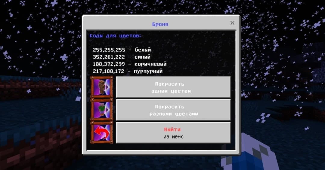 Команда: /rgb (нужно держать броню, которую вы хотите перекрасить в руках)
