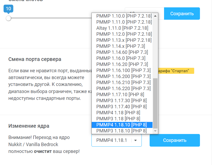 Чтобы ваше ядро могло запуститься, оно должно соответствовать версии PHP, которая установлена на сервере. Если, скажем, у вас было установлено ядро Genisys (которое работает на PHP 7.0), то последнее ядро PMMP не запустится, так как ему необходима версия PHP 8. Поэтому, перед установкой ядра выясните под какую версию PHP оно создано, установите любое ядро с этой версией PHP в Настройках вашего сервера и приступайте к следующему шагу.