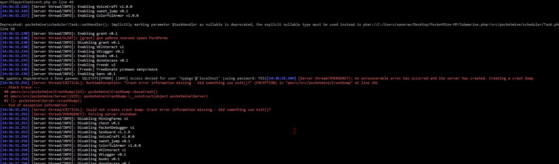 #7 phar://C:/Users/капитан/Desktop/PocketMine-MP/Submarine.phar/src/pocketmine/Server.php(1763): pocketmine\Server->exceptionHandler(Object(TypeError))